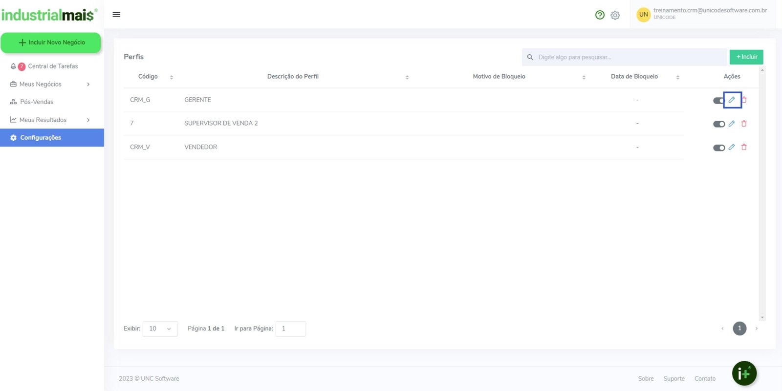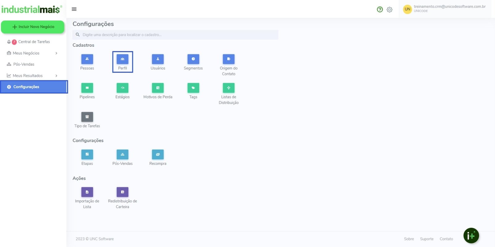 1. Para editar um motivo de perda, clique sobre ícone de engrenagem -> Configurações no menu lateral esquerdo. Selecione a opção de Perfil;