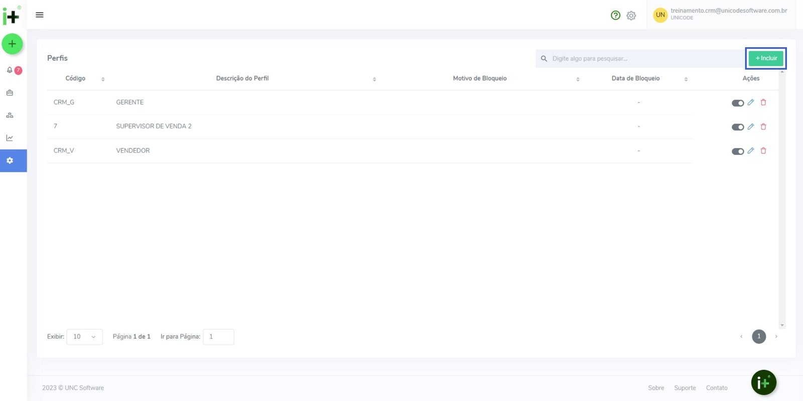 1. Para incluir um perfil de usuário, clique sobre ícone de engrenagem -> Configurações no menu lateral esquerdo. Clique sobre a opção de Perfil;