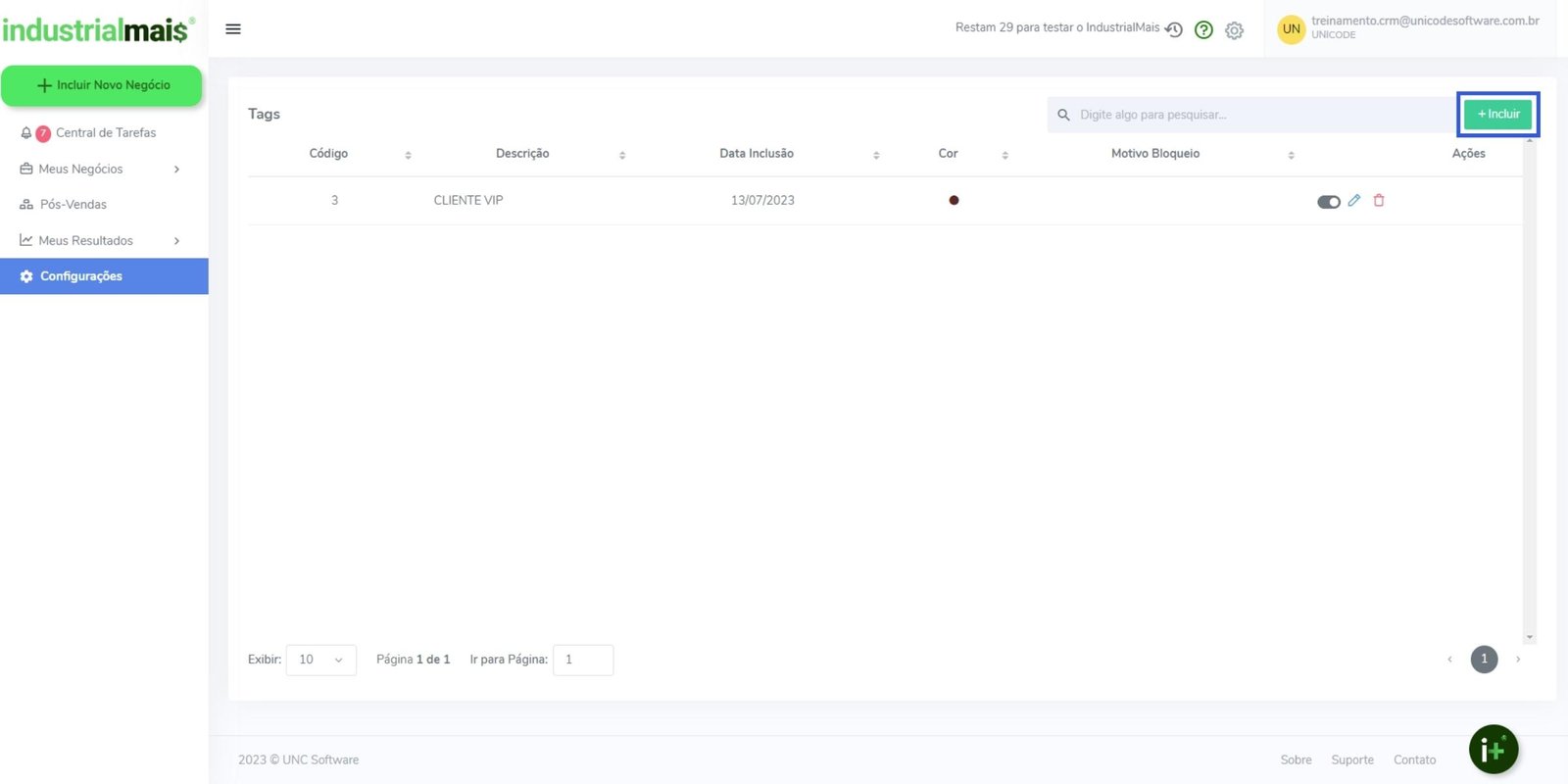 1. Para incluir uma tag, clique sobre ícone de engrenagem -> Configurações no menu lateral esquerdo e selecione a opção Tag;