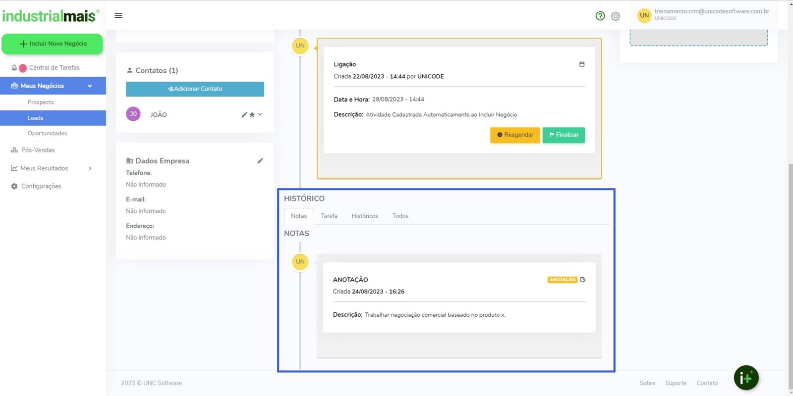 1. Para visualizar o histórico, clique sobre o negócio;