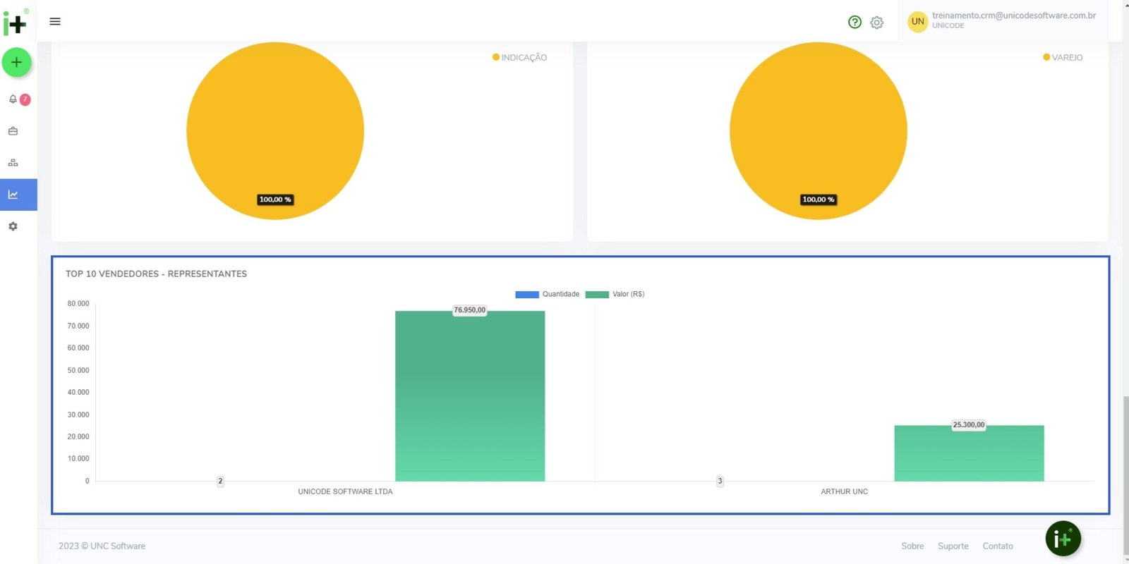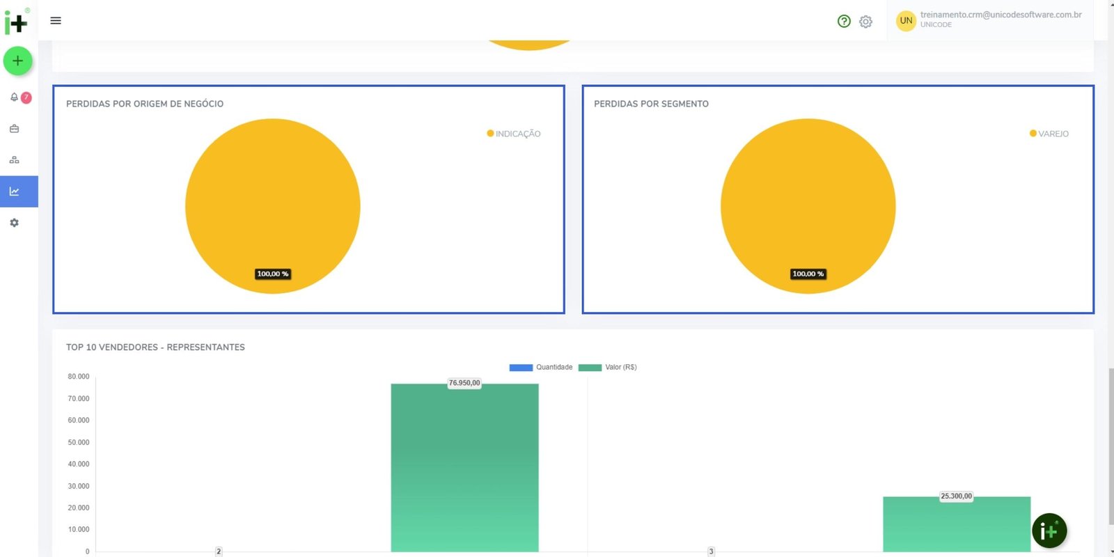 Top 10 vendedores – representantes, indicando quantidade de venda e o valor que representam.